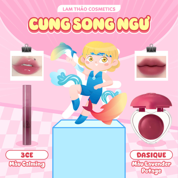 Song Ngư - cung hoàng đạo của sự lãng mạn và mơ mộng. Màu son hồng pha tím sẽ giúp bạn thể hiện vẻ đẹp dịu dàng, ngọt ngào và đầy lãng mạn. Đây là màu son lý tưởng cho những ai yêu thích sự mềm mại, nhẹ nhàng và luôn khát khao một thế giới đầy mộng mơ.