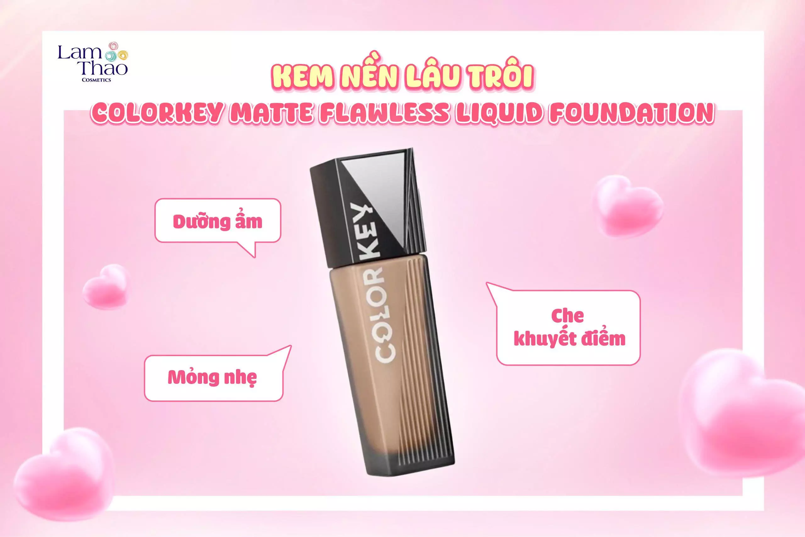 Colorkey Matte Flawless Liquid Foundation là giải pháp lý tưởng để có lớp nền nhẹ nhàng, bền màu cả ngày. Sản phẩm nổi bật giúp che đi các khuyết điểm như thâm mụn, lỗ chân lông to, mang lại làn da mịn màng, rạng rỡ mà không hề gây cảm giác nặng nề. Đây chắc chắn là một trong những bí quyết quan trọng trong cách đánh nền không bị mốc dành cho các cô nàng sở hữu làn da khô căng.