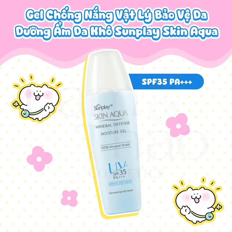 Gel Chống Nắng Vật Lý Bảo Vệ Da Dưỡng Ẩm Cho Da Khô Sunplay Skin Aqua Mineral Defense Moisture Gel SPF35 PA+++ là dòng kem chống nắng cho da khô được thiết kế theo công nghệ dưỡng ẩm tiên tiến từ Nhật Bản. Sản phẩm không chỉ tạo màng chắn bảo vệ làn da trước tia UV và ánh sáng xanh, mà còn hỗ trợ hạn chế tác động của bụi mịn. Nhờ khả năng duy trì độ ẩm, kết cấu gel giúp lỗ chân lông thông thoáng, giảm nguy cơ gây mụn và góp phần ngăn ngừa dấu hiệu lão hóa sớm.