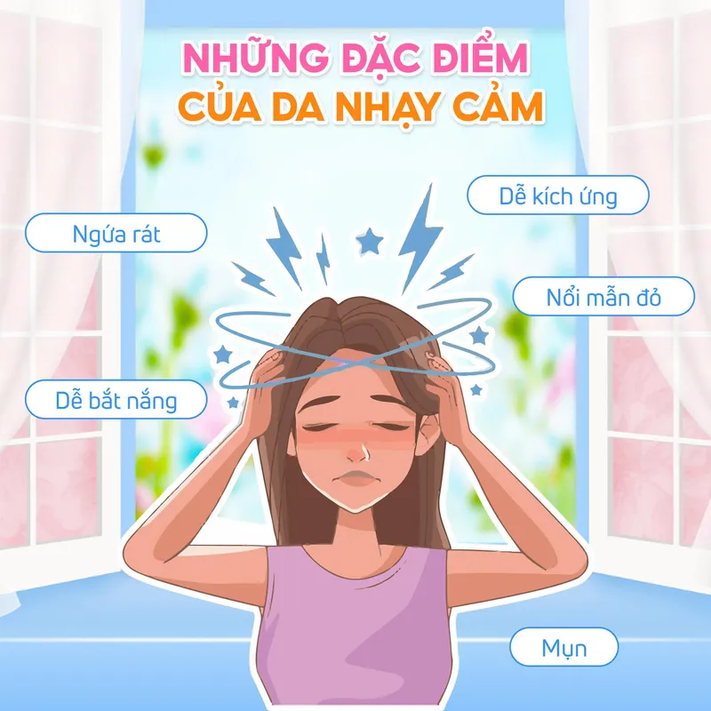 - Dễ bị kích ứng: Chỉ cần tiếp xúc với ánh nắng, gió, thay đổi nhiệt độ, hóa chất hoặc các sản phẩm dưỡng da, da nhạy cảm đã có thể phản ứng ngay bằng cảm giác khó chịu, ngứa rát.