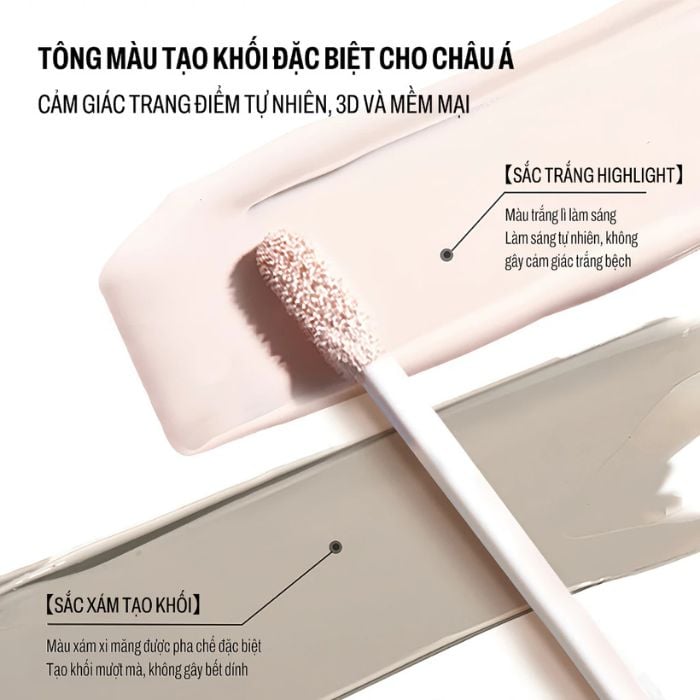 Sắc xám xi măng: Tông màu trung tính, đủ độ trầm để tạo chiều sâu cho gương mặt. Khi tán lên da, màu tiệp mượt, ôm sát đường nét tự nhiên, giúp làm rõ xương gò má, sống mũi, viền hàm mà không nặng nề.
