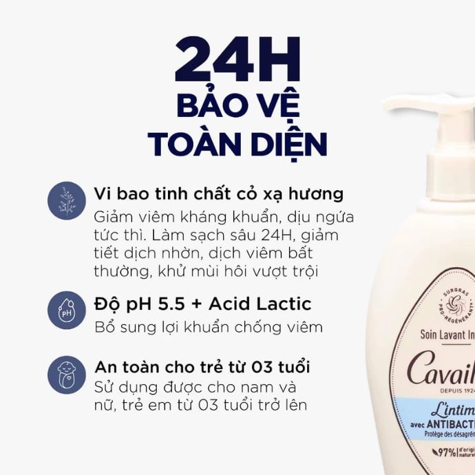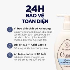 Để chăm sóc vùng da nhạy cảm một cách toàn diện, Cavaillès L'intime Avec Antibactérien không chỉ làm sạch mà còn chăm sóc và bảo vệ da từ sâu bên trong.