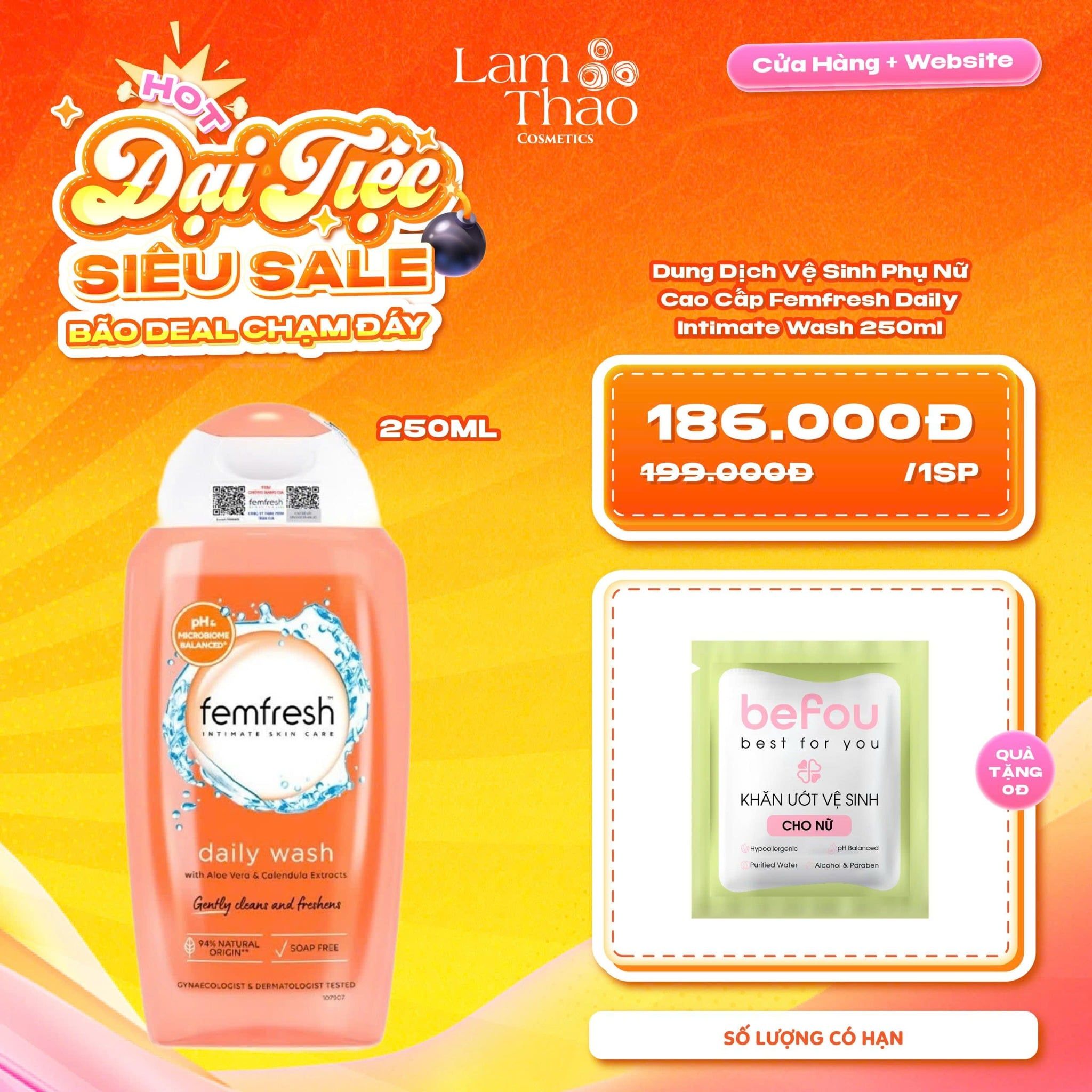 Dung Dịch Vệ Sinh Phụ Nữ Cao Cấp Femfresh Daily Intimate Wash hiện đã có mặt tại các cửa hàng Lam Thảo Cosmetics. Lam Thảo Cosmetics tự hào là thiên đường mỹ phẩm chính hãng, uy tín chất lượng giá tốt. Không chỉ vậy còn uy tín và chất lượng cùng các chương trình khuyến mãi hấp dẫn hàng tháng. Đặc biệt đang là đối tác chiến lược của Espoir tại Việt Nam. Đừng quên! Ghé ngay cửa hàng Lam Thảo Cosmetics hoặc liên hệ về fanpage của chúng mình để được tư vấn về dung dịch vệ sinh cũng như Dung Dịch Vệ Sinh Phụ Nữ Cao Cấp Femfresh Daily Intimate Wash ngay nhé!