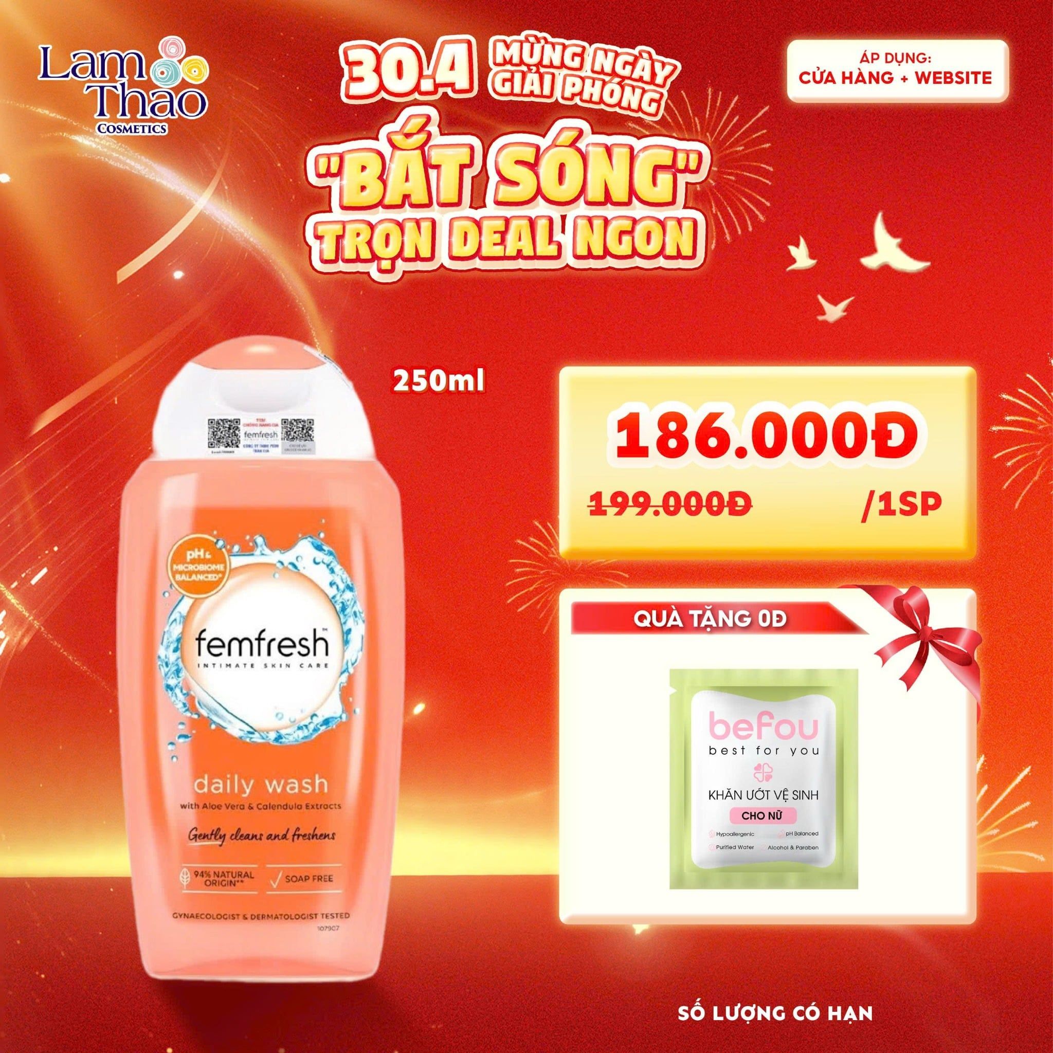 Dung Dịch Vệ Sinh Phụ Nữ Cao Cấp Femfresh Daily Intimate Wash hiện đã có mặt tại các cửa hàng Lam Thảo Cosmetics. Lam Thảo Cosmetics tự hào là thiên đường mỹ phẩm chính hãng, uy tín chất lượng giá tốt. Không chỉ vậy còn uy tín và chất lượng cùng các chương trình khuyến mãi hấp dẫn hàng tháng. Đặc biệt đang là đối tác chiến lược của Espoir tại Việt Nam. Đừng quên! Ghé ngay cửa hàng Lam Thảo Cosmetics hoặc liên hệ về fanpage của chúng mình để được tư vấn về dung dịch vệ sinh cũng như Dung Dịch Vệ Sinh Phụ Nữ Cao Cấp Femfresh Daily Intimate Wash ngay nhé!