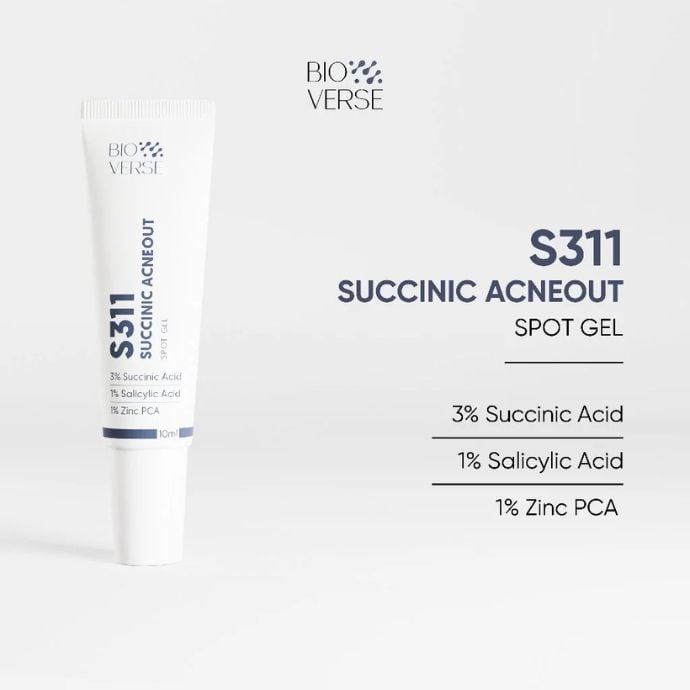 Gel Chấm Mụn Hỗ Trợ Giảm Khuẩn Và Se Còi Mụn Bioverse S311 Succinic Acneout Spot Gel là sản phẩm dịu nhẹ dành cho làn da mụn, giúp giảm sưng đỏ và hỗ trợ se còi mụn một cách êm ái. Với 3% Succinic Acid kết hợp cùng Salicylic Acid và Zinc PCA, gel giúp kiểm soát dầu thừa, làm thông thoáng lỗ chân lông, hỗ trợ nhân mụn thoát ra dễ dàng và ngăn ngừa mụn mới hình thành. Thêm một chút Gel S311 mỗi ngày, để làn da trở nên nhẹ nhàng, sạch mụn và được yêu thương đúng cách.