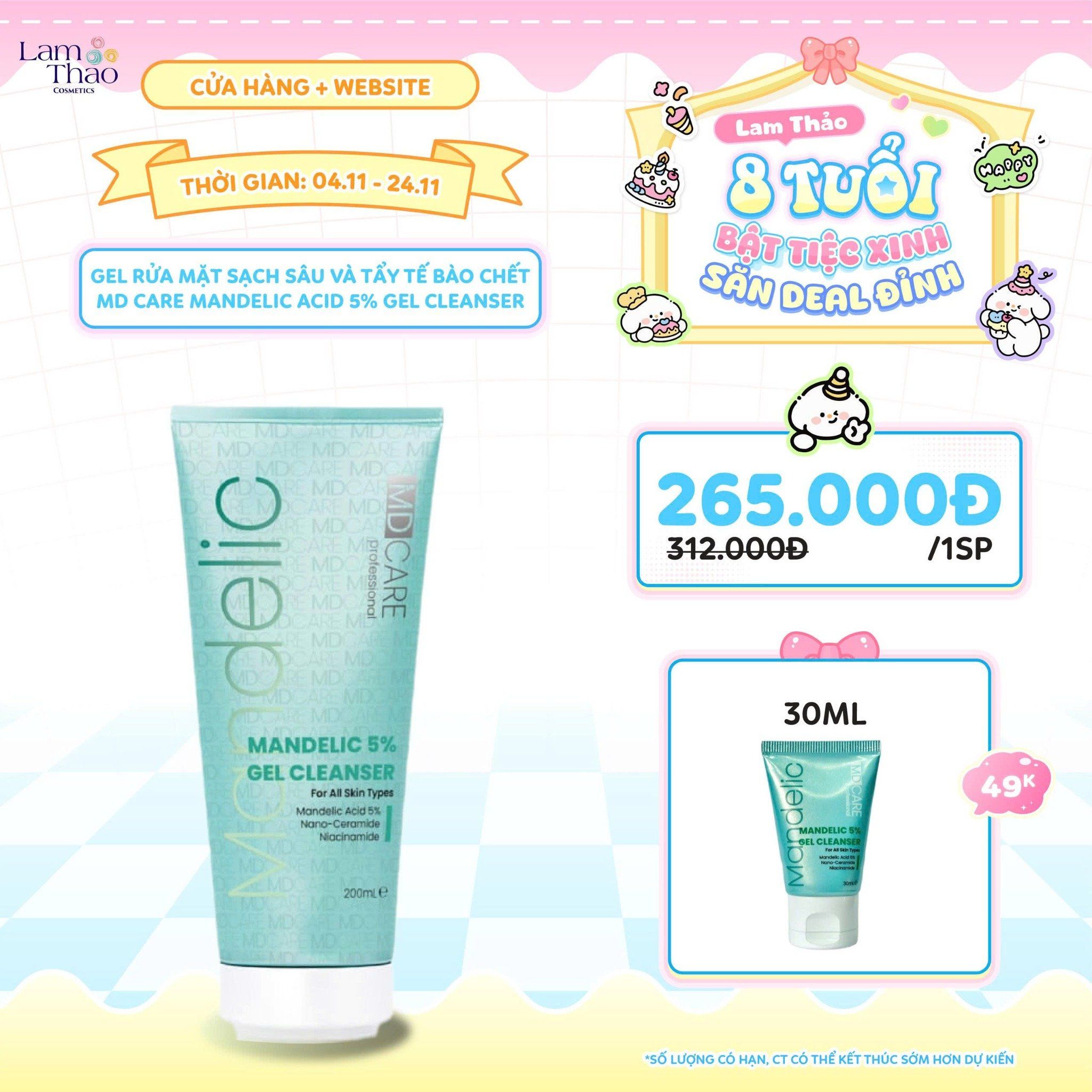 [DUY NHẤT CH: DEAL SỐC 10.11 - 24.11 MUA HOÁ ĐƠN 499K TẶNG SERUM SÁNG DA ĐA TẦNG] [DEAL SỐC 4.11 - 24.11 TẶNG GEL RỬA MẶT MD CARE 30ML] Gel Rửa Mặt Sạch Sâu Và Tẩy Tế Bào Chết MD Care Mandelic Acid 5% Gel Cleanser