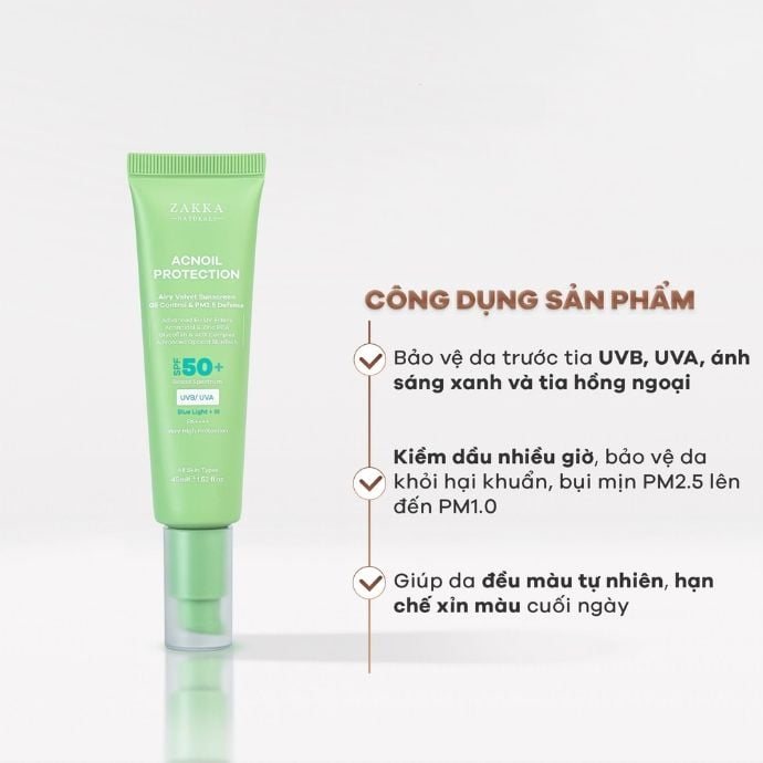 Kem Chống Nắng Kiềm Dầu Zakka Naturals Acnoil Protection Airy Velvet Sunscreen Oil Control SPF50+ PA++++ & PM2.5 Defense