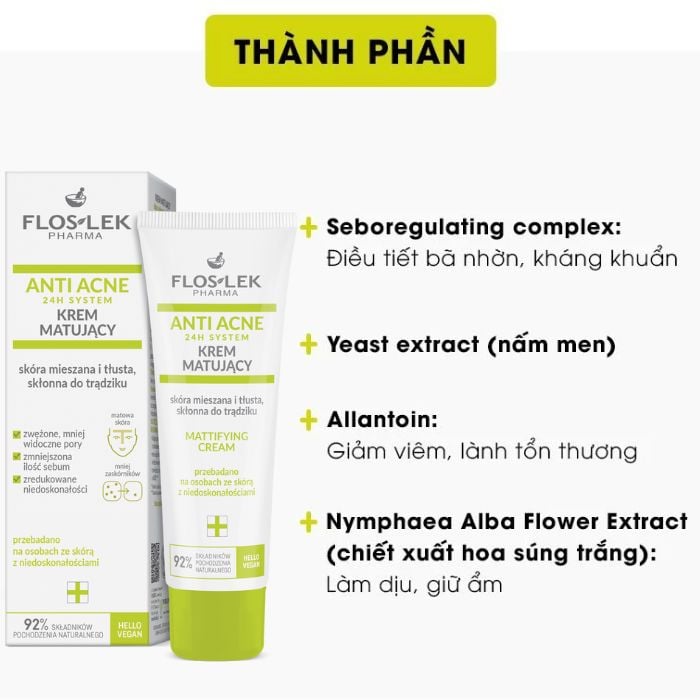 Kiềm dầu – cấp ẩm – hỗ trợ ngừa mụn, tất cả gói gọn trong một sản phẩm. Đừng để làn da dầu mụn ngăn cản sự tự tin của bạn, hãy trải nghiệm ngay Kem Dưỡng Ẩm Kiềm Dầu Floslek Anti Acne 24h System Mattifying Cream Mixed Oily And Acne Prone Skin tại Lam Thảo Cosmetics để thấy sự khác biệt từng ngày.