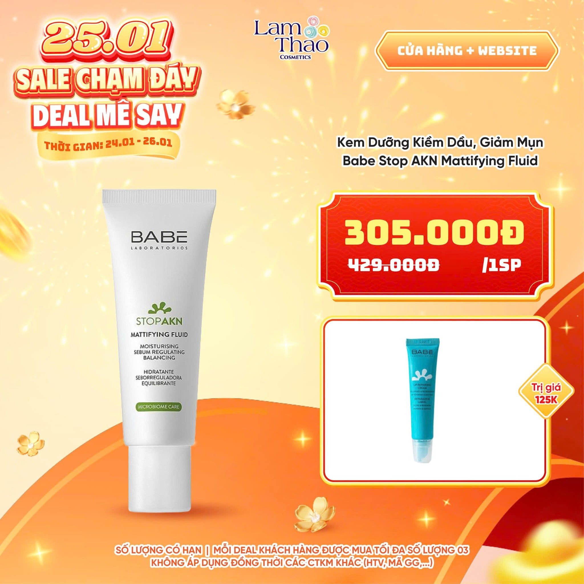 Chăm sóc da dầu mụn chưa bao giờ nhẹ nhàng và dễ chịu đến thế với Kem Dưỡng Kiềm Dầu Giảm Mụn Babe Stop AKN Mattifying Fluid. Với công thức dịu nhẹ, sản phẩm giúp kiểm soát dầu thừa, giảm mụn và dưỡng ẩm cho làn da, để da luôn tươi sáng và mềm mại suốt cả ngày. Tại Lam Thảo Cosmetics, bạn có thể yên tâm sở hữu sản phẩm chính hãng, lành tính - mỗi lần chăm sóc da không chỉ là bước làm đẹp mà còn là khoảnh khắc thư giãn, tự thưởng cho bản thân, giúp bạn luôn cảm thấy tự tin và rạng rỡ mỗi ngày.