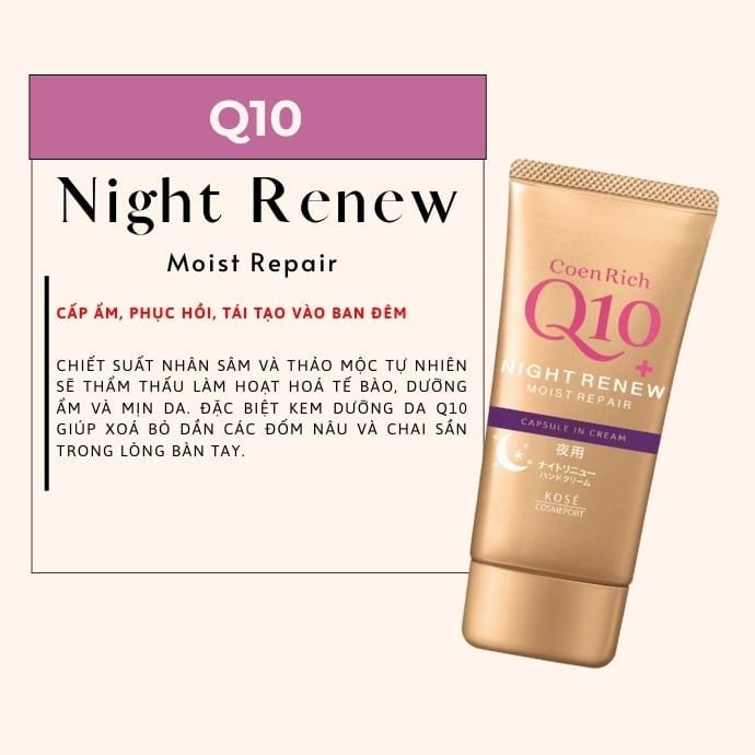 Đôi tay cũng cần được yêu thương và chăm sóc sau một ngày dài, và Kem Dưỡng Da Tay Kose Coen Rich Q10+ Night Renew Moist Repair chính là liều vitamin dịu dàng cho làn da tay bạn. Với Coenzyme Q10, sản phẩm giúp phục hồi, làm mềm mịn, làm sáng và ngăn ngừa lão hóa hiệu quả trong khi bạn ngủ. Mỗi sáng thức dậy, bạn sẽ cảm nhận được đôi tay mềm mại, tươi sáng và tràn đầy sức sống như vừa được tái sinh.