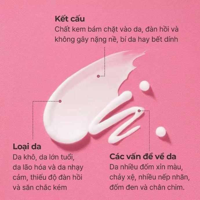 - Giảm nếp nhăn và vết chân chim: Chứa collagen phân tử thấp và retinol dịu nhẹ giúp cải thiện độ đàn hồi, làm mờ dần nếp nhăn li ti quanh mắt.