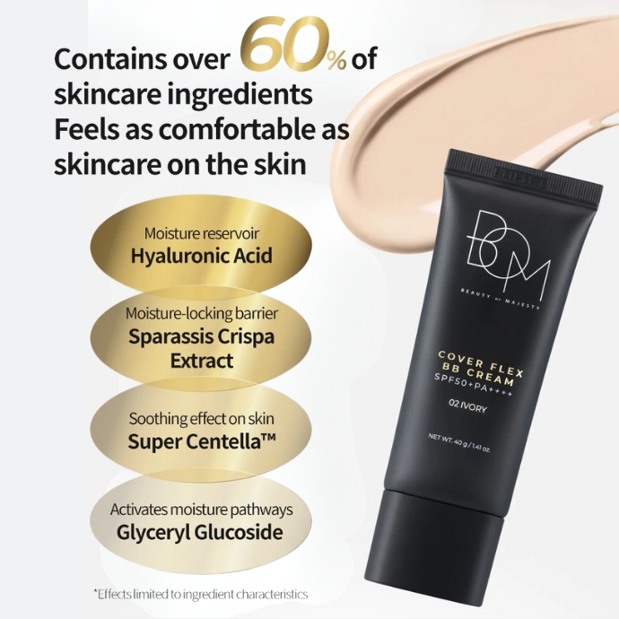 Kem nền BOM Cover Flex BB Cream SPF50+ PA++++ chính là minh chứng rõ nét cho triết lý ấy, khi kết hợp trọn vẹn khả năng che phủ, dưỡng ẩm và chống nắng để bạn luôn rạng rỡ và tự tin mỗi ngày.