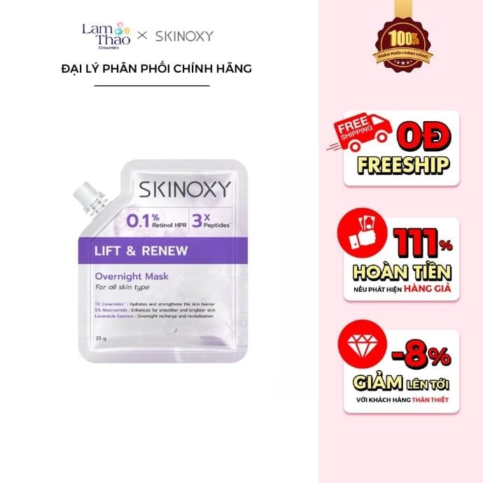Khi bạn chọn dành chút thời gian chăm sóc bản thân mỗi tối, làn da cũng sẽ đáp lại bằng sự tươi tắn và rạng rỡ vào mỗi sớm mai. Mặt Nạ Dưỡng Skinoxy Lift & Renew Overnight Mask chính là một bước nhỏ nhưng đủ để bạn cảm nhận sự thay đổi dịu dàng ấy từng ngày. Nếu bạn đang tìm nơi mua sản phẩm chính hãng, giá dễ thương và được tư vấn tận tâm, Lam Thảo Cosmetics luôn sẵn sàng đồng hành cùng bạn trong hành trình chăm da nhẹ nhàng mỗi đêm. Hãy để Lam Thảo giúp bạn mang về một giấc ngủ ngon và một làn da đẹp hơn ngày hôm qua nhé. ✨