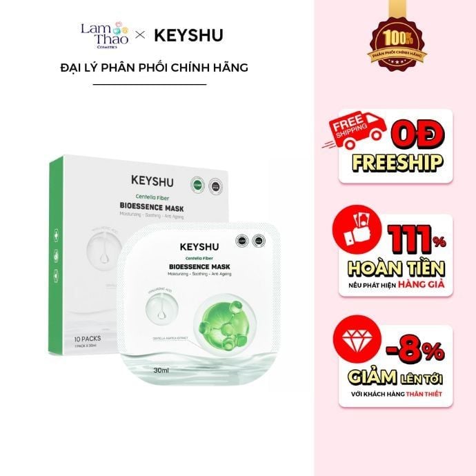 KEYSHU – thương hiệu dược mỹ phẩm tiên phong kết hợp hoạt chất thiên nhiên và sinh học, hợp tác cùng Viện Nghiên cứu Dược Phẩm & Mỹ Phẩm Việt Nam (IPCR) để tạo ra sản phẩm chuyên biệt, an toàn và hiệu quả cho làn da. Mỗi sản phẩm của Keyshu đều trải qua quy trình chọn lọc khắt khe, đảm bảo mang lại sự an toàn và kết quả rõ rệt. Và Centella Fiber Bio Essence Mask chính là minh chứng rõ nhất cho triết lý “chăm sóc da thông minh – nuôi dưỡng làn da khỏe từ gốc”.