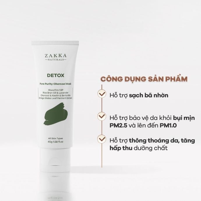 Mặt Nạ Zakka Naturals Detox Pore Purity Charcoal Mask giúp thanh lọc làn da sau một ngày dài tiếp xúc với bụi bẩn và dầu thừa, đồng thời hỗ trợ làm sạch sâu mà vẫn giữ được cảm giác dễ chịu trên da.