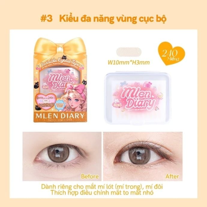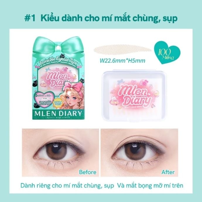 Sở hữu đôi mắt một mí, mí lót hay mí sụp thường khiến nhiều người e ngại khi trang điểm - mí khó lên form, còn các loại kích mí truyền thống thì lại lộ viền và kém tự nhiên. Mong muốn có đôi mắt hai mí rõ nét nhưng vẫn nhẹ nhàng như thật luôn là “bài toán khó” với không ít chị em. Đáp ứng mong muốn sở hữu nếp mí đẹp mà vẫn tự nhiên, Miếng Dán Kích Mí Vô Hình Tự Nhiên Mlen Diary ( Mẫu Mới ) mang đến giải pháp thoải mái cho đôi mắt mỗi ngày.