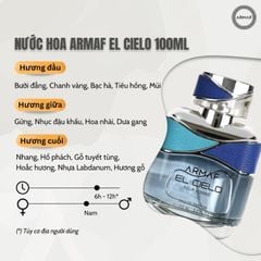 Nước Hoa Armaf El Cielo Pour Homme Eau De Parfum là mùi hương mở ra bằng làn gió citrus mát lành, đem đến cảm giác tươi mới như một buổi tối hè dịu nhẹ. Khi hương đầu tan đi, sự ngọt mềm của dưa lưới và chút ấm áp từ oải hương và gỗ hiện lên, đầy tinh tế và rất dễ thương theo cách nam tính. Với độ lưu hương ổn định và tỏa hương gần, El Cielo giúp phái mạnh tự tin xuất hiện trong mọi khoảnh khắc. Đây sẽ là lựa chọn hoàn hảo cho chàng trai muốn thơm một cách tinh tế, không phô trương nhưng vẫn thật cuốn hút.