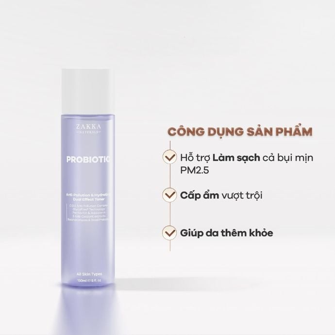 Khói bụi và ô nhiễm mỗi ngày khiến làn da dễ mất cân bằng, trở nên nhạy cảm và khó hấp thụ dưỡng chất. Nhiều loại toner chỉ cấp ẩm đơn thuần nhưng chưa đủ để làm sạch sâu các tác nhân gây hại còn sót lại sau bước rửa mặt. Đó là lý do Nước Hoa Hồng Zakka Naturals Probiotic Anti-Pollution & Hydrating Dual Effect Toner ra đời, kết hợp khả năng làm sạch bụi mịn, giúp làn da được bảo vệ và cấp ẩm nhẹ nhàng ngay từ bước đầu tiên của chu trình skincare.