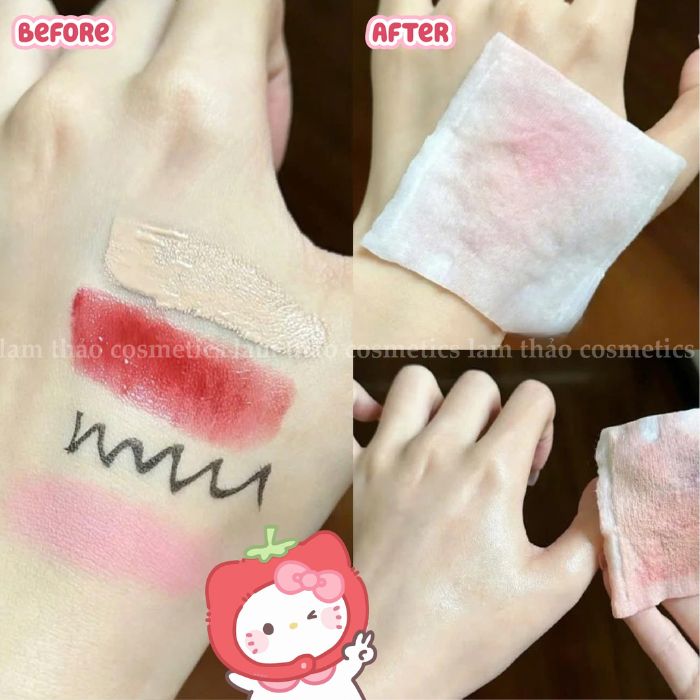 Nhẹ nhàng lau lên mặt, mắt và môi cho đến khi lớp makeup được loại bỏ hoàn toàn.