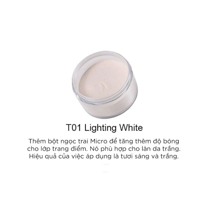 T01 Lighting White: Mang đến làn da trắng sáng, pha ánh ngọc trai siêu lấp lánh, tạo cảm giác da căng bóng và rạng rỡ.