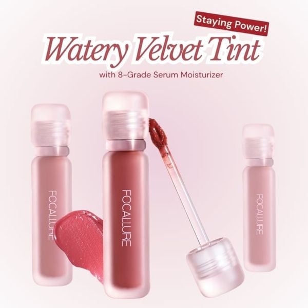 Son Focallure Watery Velvet Lip Tint mang đến trải nghiệm mềm mại như làn sương chạm môi, chất son nhung mịn tan đều, nhẹ tênh và êm ái. Kết cấu nhẹ tênh giúp son tán đều, không vón, cho đôi môi mịn màng và căng bóng tự nhiên như phong cách makeup Hàn Quốc. Với 8 thành phần dưỡng ẩm và khả năng giữ màu lên đến 8 giờ, son giúp môi luôn mềm mượt, tươi tắn và rạng rỡ suốt ngày dài.
