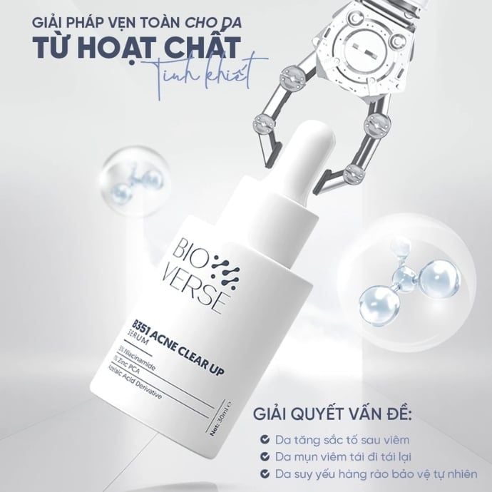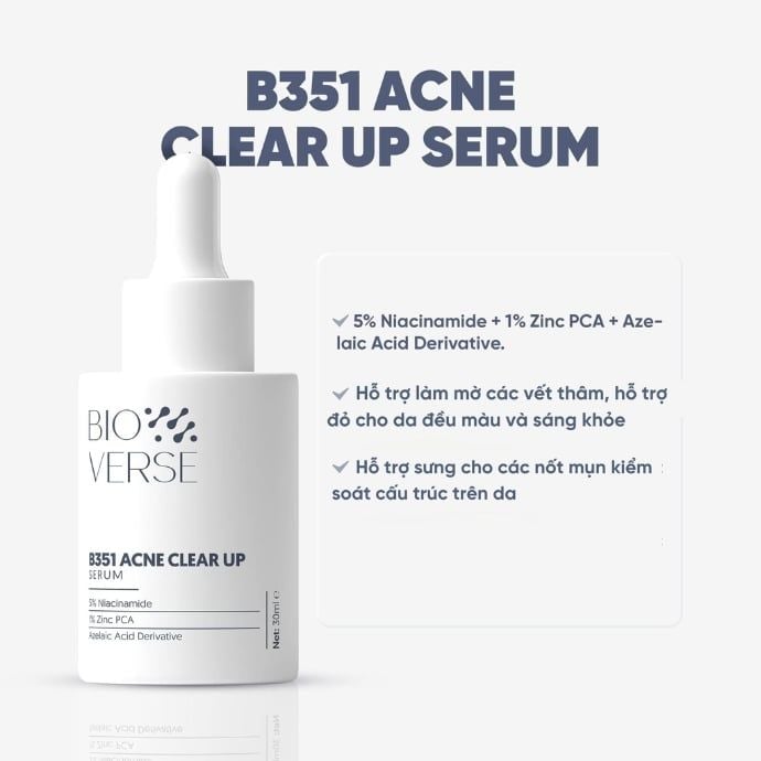 Những nốt mụn “khó ưa”, vết thâm lì lợm hay vùng da ửng đỏ sau mụn luôn khiến nhiều bạn mất tự tin khi soi gương mỗi sáng. Dù đã thử đủ loại sản phẩm, làn da vẫn dễ kích ứng, sạm xỉn và khó phục hồi. Hiểu được nỗi lo ấy, Bioverse đã mang đến Tinh Chất Hỗ Trợ Mờ Thâm Mụn Bioverse B351 Acne Clear Up Serum - tinh chất lành tính giúp làm dịu da, hỗ trợ mờ thâm và cải thiện những vấn đề thường gặp trên da mụn, trả lại cho bạn làn da mịn màng và tươi sáng như mong đợi.