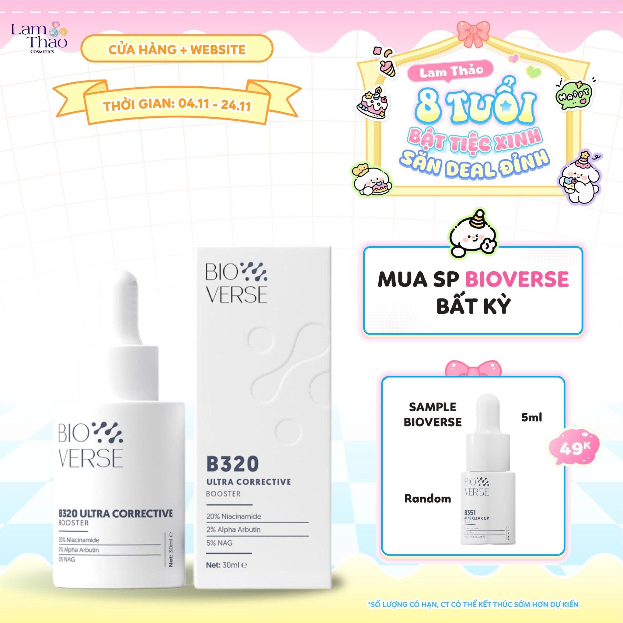 Với Tinh Chất Sáng Da Mờ Thâm Bioverse B320 Ultra Corrective Booster, làn da của bạn sẽ được chăm sóc toàn diện, từ làm mờ vết thâm, đều màu da cho đến nuôi dưỡng và bảo vệ mỗi ngày. Hãy để Lam Thảo Cosmetics đồng hành cùng bạn trên hành trình yêu chiều làn da, mang đến những sản phẩm an toàn, chất lượng và phù hợp với mọi nhu cầu chăm sóc da. Khám phá ngay chính hãng ngay hôm nay và trải nghiệm sự khác biệt cho làn da của bạn!