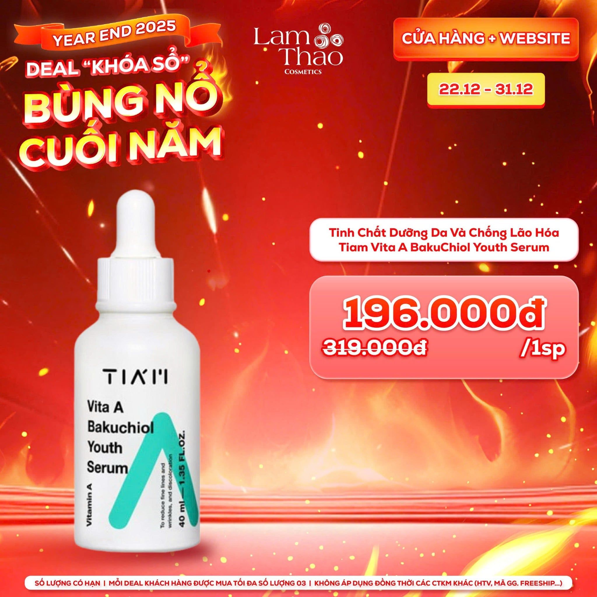 - Tinh Chất Dưỡng Da Và Chống Lão Hóa Tia'm Vita A BakuChiol Youth Serum có tác dụng: giúp thúc đẩy sản xuất collagen và elastin từ bên trong để làm da săn chắc và căng mọng theo thời gian, mang lại vẻ rạng rỡ trẻ trung bên trong cho làn da; giúp làm mờ các nếp nhăn và cải thiện kết cấu da thô ráp cho làn da mềm mịn hơn; giúp làm sáng da, làm mờ các vết thâm nám, đồi mồi, giúp cải thiện tình trạng da xỉn màu và da không đều màu.