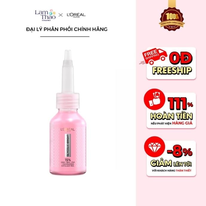 Làn da xỉn màu, sạm thâm và thiếu sức sống là nỗi lo chung của nhiều cô gái sau những ngày dài tiếp xúc với khói bụi, ánh nắng và stress. Đừng vội lo, giờ đây bạn có thể “lột xác” cho làn da ngay tại nhà với Tinh Chất L'Oreal Paris Glycolic Bright Anti Dark Spot Exfoliant Peel 15%. Sản phẩm sẽ giúp làm sạch sâu, tẩy tế bào chết nhẹ nhàng và phục hồi độ sáng mịn, để bạn luôn tỏa sáng theo cách tự nhiên nhất.