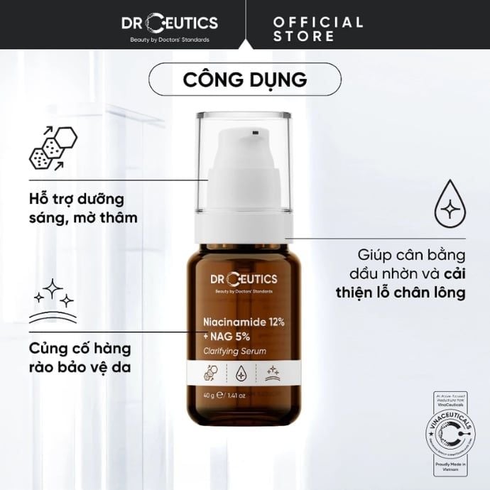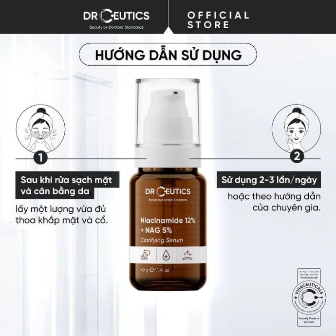 Làn da không đều màu, vết thâm sau mụn và cảm giác xỉn thiếu sức sống là nỗi trăn trở của nhiều cô gái mỗi khi soi gương. Thay vì tìm kiếm những giải pháp “cấp tốc”, đã đến lúc làn da được chăm sóc một cách đúng đắn và dịu dàng hơn. Tinh Chất Làm Trắng Dr.Ceutics Niacinamide 12% + NAG 5% Clarifying Serum với công thức cải tiến cùng cơ chế làm sáng kép từ Niacinamide và NAG sẽ giúp phục hồi làn da từ sâu bên trong, mang lại vẻ sáng mịn, trong trẻo và tràn đầy sức sống.